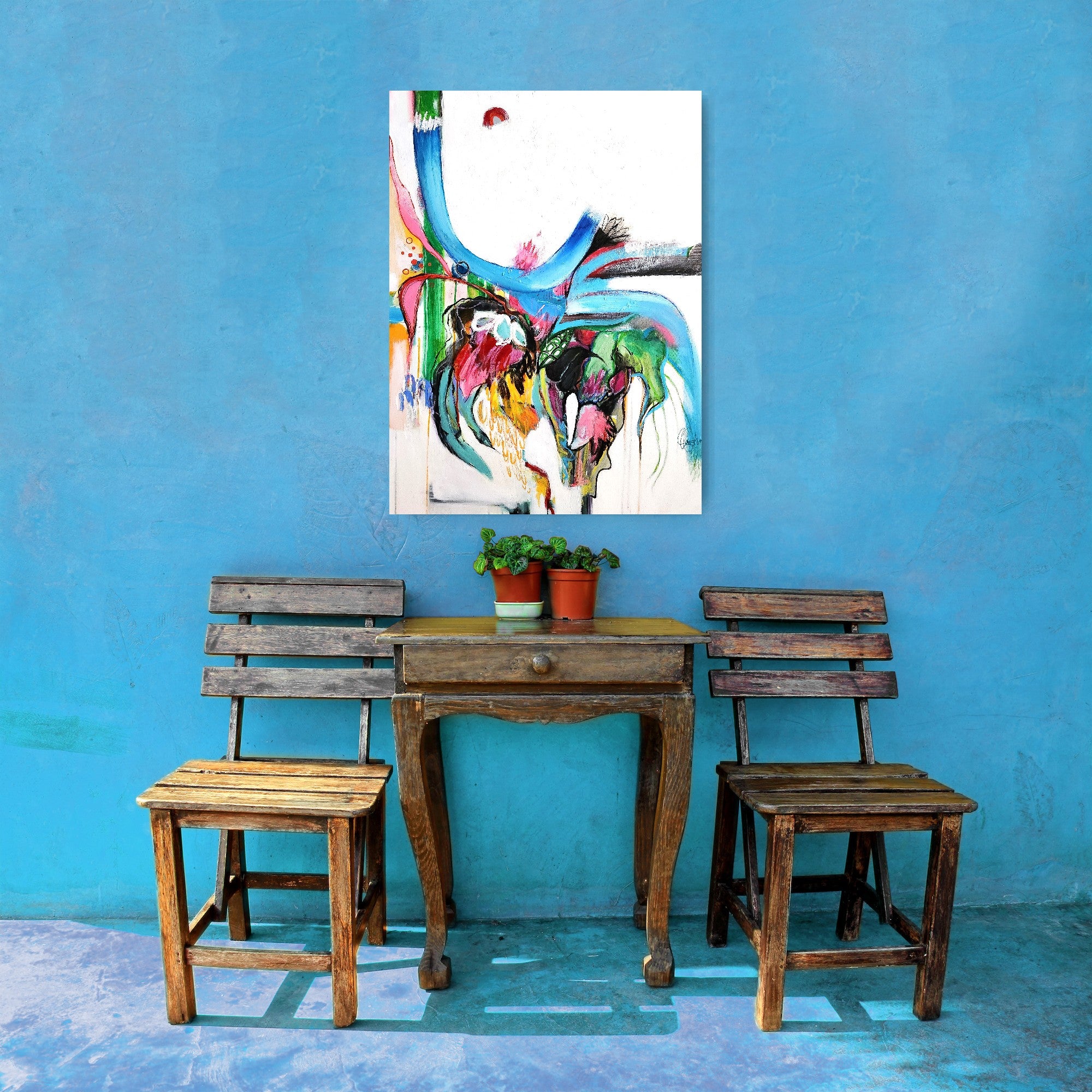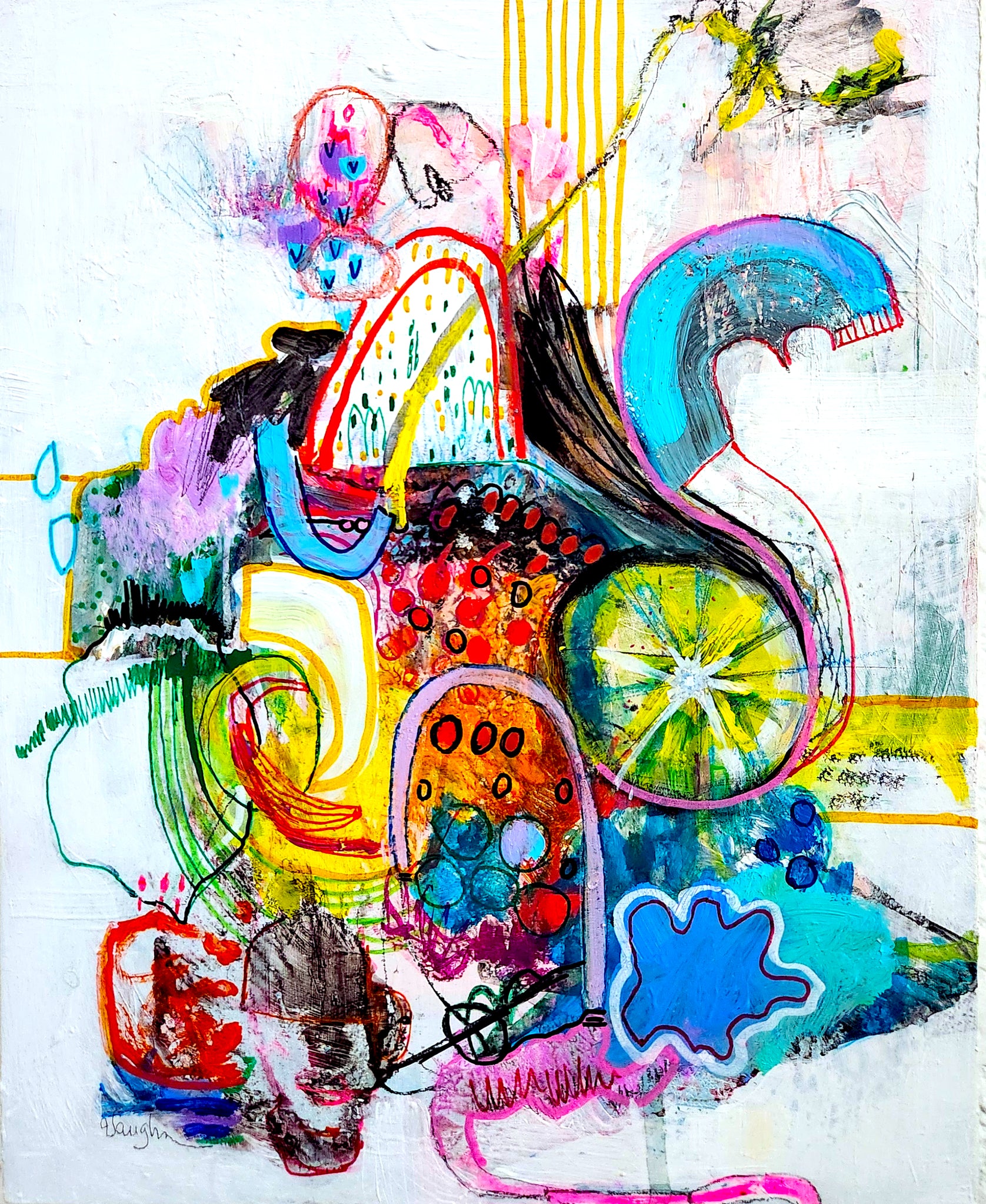 Original oil painting by Liz Vaughn, "Joy Ride. Switching back and forth between a graphic figurative style and an abstract style provides a certain type of artistic freedom.  If one style feels heavy and overworked, I allow myself to move into a different space.  I believe it helps me evolve with each new creation, and it keeps things fresh.