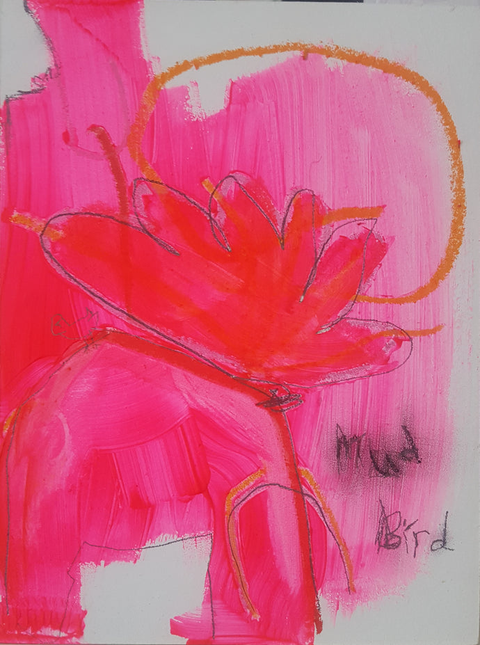 Original oil painting by Liz Vaughn, "Mud Bird" a nod to Outsider art, a bit of breaking the artistic block, and just letting shapes and lines take form. Gestural and completely free flowing - complete with a tiny wonky bird on the left. If hot pink is your color, then Mud Bird is your girl!