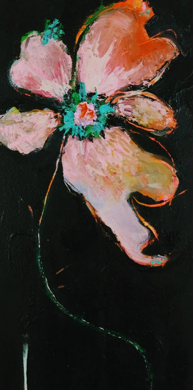 Original oil painting by Liz Vaughn, "Noir Series" in pink. To be truthful, the Noir Series was created in a moment of frustration when I blacked out most of an abstract painting that I was working on. When I came back to the painting, there was an area that was smudged with oil paint and it just seemed interesting. Sometimes, you just have to go with an idea even if you don't know where it will end up! Thankfully it turned out and gave me a new direction to explore. I scratched in to the black paint, revealing the colorful underlayers to create the stem and leaf on the flower.
